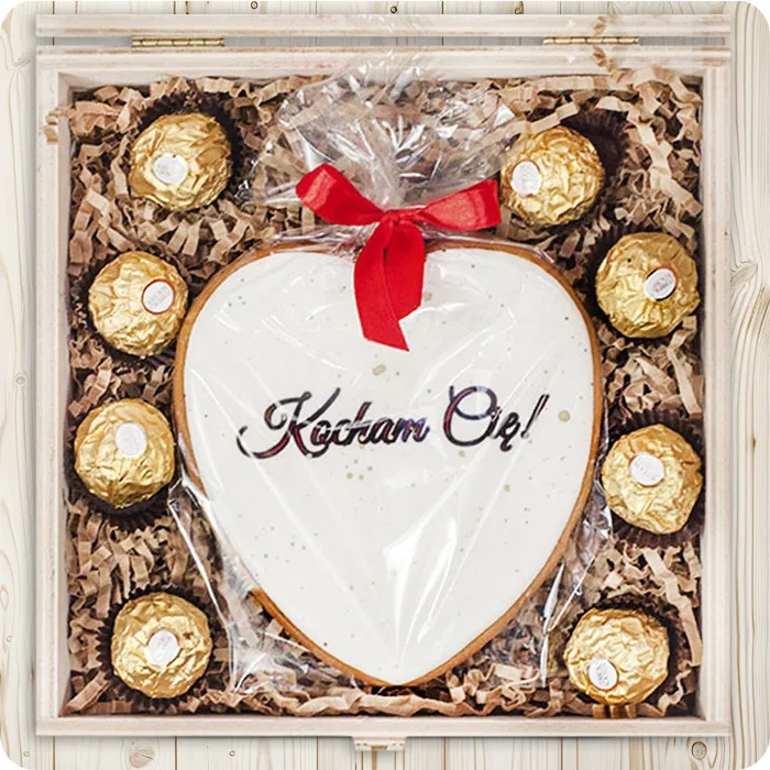 P.S. I Love You is a unique gift that combines sweet tenderness and a romantic message. Housed in an elegant wooden, lockable box, this set perfectly expresses feelings and is suitable for various occasions, from anniversaries to confessions of love.The main star of this set is a heart-shaped gingerbread man with "I love you" written on it. It is not only a delicious sweet, but also a romantic touch that adds a personal touch to the gift. Gingerbread gently conveys unique words, making every bite a moment full of love.Next to the gingerbread are Ferrero Rocher pralines – known and appreciated by many gourmets. These are classic, crunchy nuts in milk chocolate that add elegance and sophistication to this sweet set. The perfect combination of chocolate, nuts and cream makes each of these treats a small masterpiece.P.S. I Love You is not only a collection of delicious treats, but also an expression of feelings and care for a loved one. It will be perfect as a gift for Valentine's Day, an anniversary or just on a day when you want to express your love in a special way.See more similar products here: Gifts