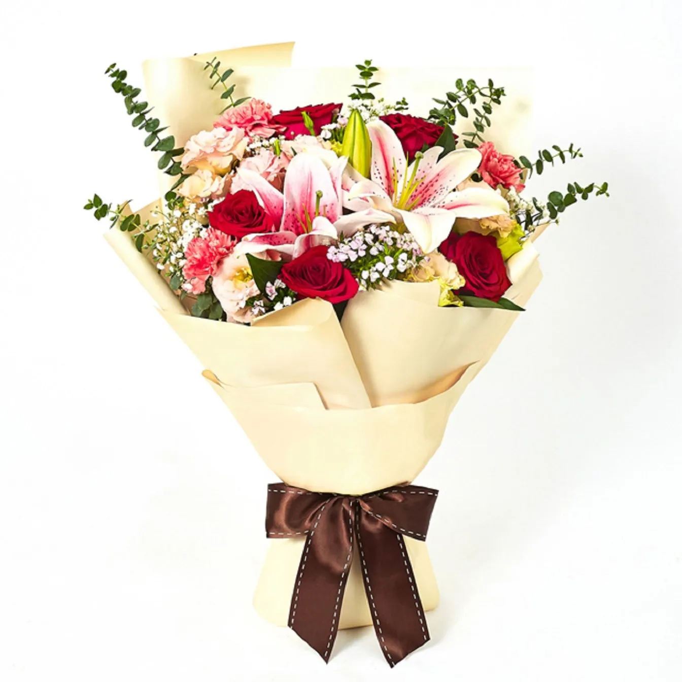 A stunning mixed bouquet featuring fragrant pink lilies, classic red roses, and soft pastel blooms, artfully arranged with fresh greenery and wrapped in elegant cream paper finished with a rich brown ribbon. Perfect for birthdays, anniversaries, romantic gestures, or celebrations, offering a beautiful balance of colour, fragrance, and style for any special occasion.