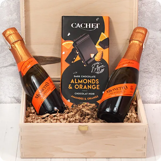 Orange Box is a phenomenal gift that transports the recipient to an aromatic world of chocolate sensations and delicate prosecco bubbles. Housed in an elegant wooden box, the set is a unique blend of flavours, perfect for a variety of occasions.At the center of this set is Cachet orange chocolate with nuts. This is a delicious chocolate that boldly combines the intensity of dark chocolate with the refreshing taste of orange and the crunchiness of nuts. It is a real treat for the palate, where every bite opens the door to the world of refined flavours.To complete this unique experience, the box contains two small bottles of prosecco. This sparkling wine with delicate bubbles brings lightness and elegance to the moment of consumption. The joyful taste of prosecco blends perfectly with the intensity of chocolate, creating a harmonious symphony of flavours.The wooden box that houses this tasteful set adds to the overall elegant and classic aesthetic. Closable with a clip, the box can serve as a practical souvenir of a delicious experience or as a charming stash for trinkets.The orange box is not only a gift for the palate, but also an expression of care and attention to detail. It will be perfect as a gift for many occasions, from birthdays to romantic get-togethers, always adding a touch of luxury and taste to special moments.Poczta Kwiatowa® Zamówienia opłacone do godziny 17:00 doręczymy następnego dnia roboczego. Zamówienia na terenie Warszawy doręczamy tego samego dnia po potwierdzeniu telefonicznym. Do wybranych miejscowości doręczamy prezenty także w sobotę.