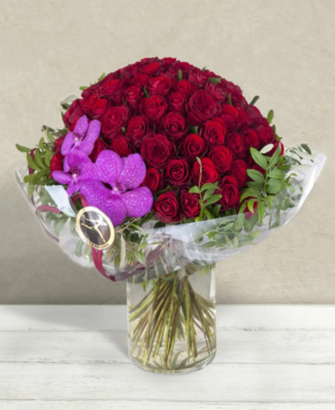 Bouquet of 101 red roses, 3 vandal orchids and decorative green. The style and importance of this floral creation is intended for unique occasions.