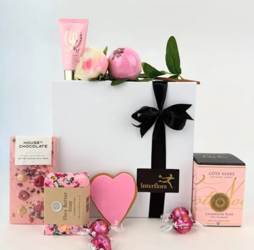 Box Includes: House of Chocolate Raspberry Chocolate Bar, Tilley Bath Bomb, MOR Marshmallow Hand Cream, Anoint Shea Butter Soap Lavender and Honey Cote Noire Rose Petal Soy Candle 75gm, Molly Woppy Gingerbread Cookie, Strawberry and Cream Lindt Balls, Silk Pink Rose. We'll endeavour to create your gift exactly as pictured, however if an item is out of stock it'll be replaced with an item of the same type and value.Needs to be ordered 2 working days in advance. Can not be ordered with flowers.