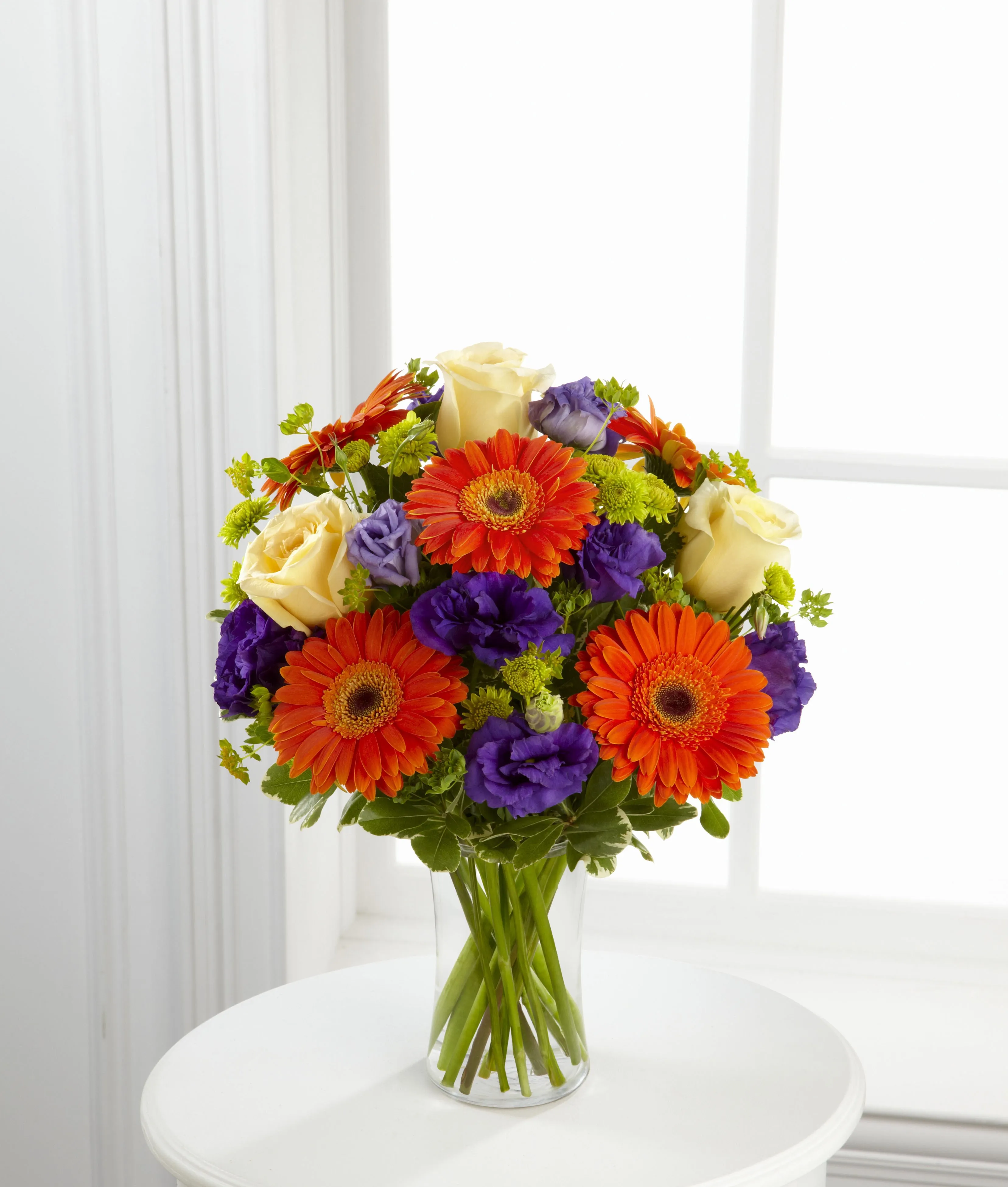 This Bouquet is a cheerful burst of color to extend your deepest sympathies. Flowers such as cream-color roses, orange gerbera daisies, purple lisianthus, green button pompons and greenery are arranged in a vase. (Flowers may vary.) Only fresh and beautiful plants and flowers locally selected by a florist in Panama.