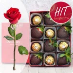 Dark And Gold Strawberries in Dark Chocolate with Ferrero Rocher + Red Rose