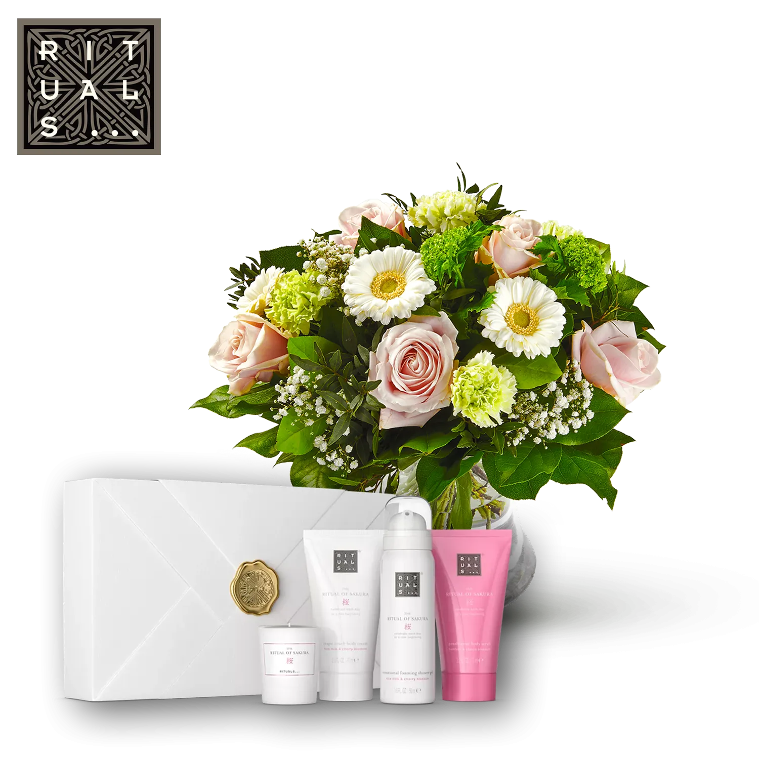 Rebalance body, mind and soul with this small gift. Dependingon stock availability with the florist, a Ritual or Sakura giftset will be provided. This gift set contains a foaming shower gel, shower oil, shampoo and body cream. The perfect gift for a friend or family member, or just to treat yourself! Give the packaging of this gift set a second life by storing photos, letters or other objects.Vase excl.