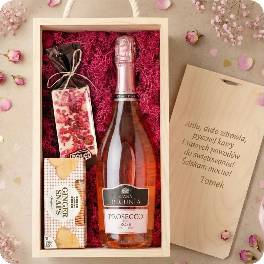 Are you looking for a gift that will delight and fully reflect the delicacy and uniqueness of the gifted person? The "Secret of a Woman" set is a carefully composed composition enclosed in a stylish wooden box - a true quintessence of elegance and excellent taste. The combination of refreshing bubbles with exquisite sweets makes it the perfect gift for Women's Day, birthdays, anniversaries, Valentine's Day or as a form of special thanks.