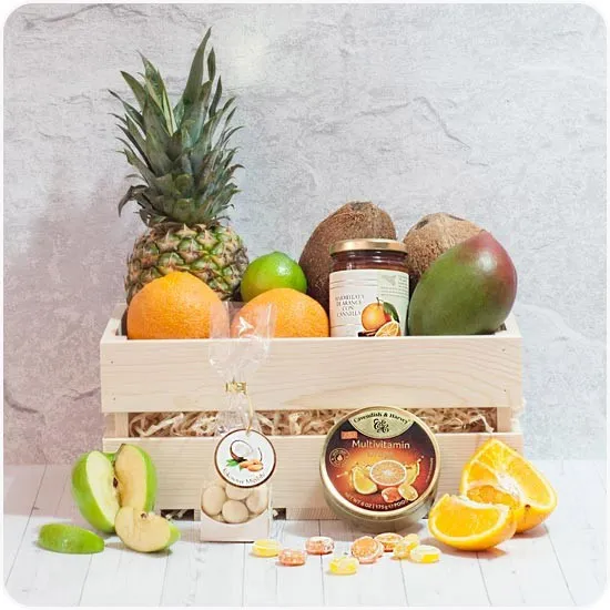 Gift full of fruit can be an interesting proposition for everyone! The fruit box is the best example of this. Apart from many kinds of fruit in the form of pineapple, lime, mango, coconut, apple or orange, we can also find Sicilian orange jam, orange cavendish & harvey candies and coconut Doti. Together they create a composition perfect for any occasion.
