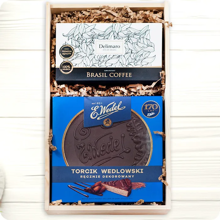 Cake Box hides real treasures of culinary experience. Once opened, you will discover a unique set that will take you on a journey through the most exquisite flavors.Wedel cake, the ornament of our box, is an icon of Polish confectionery - delicate, velvety, melting in the mouth. Its rich flavor and traditional recipe make it an unforgettable experience for the palate.To complement this unique gift, we have included Delimaro instant coffee - an aromatic coffee that will stimulate your senses and additionally sweeten the moment of rest.Riston black tea is an extra touch to our box - rich in flavor and aroma, perfect for a relaxing afternoon break or morning wake-up.The Cake Box is more than a set of products - it is a story of taste, tradition and special moments spent together over aromatic coffee and tea. Open it and let yourself be taken on a journey through the world of culinary sensations and pleasures.