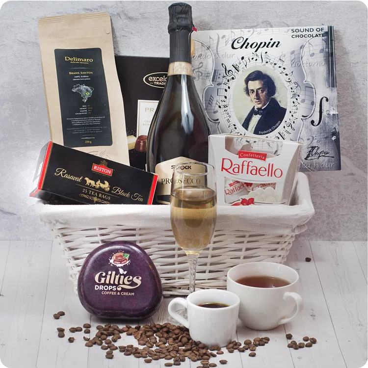 Make a pleasure and surprise your loved ones! Give them a gift basket from the Poczta Kwiatowa® offer perfect for any occasion - Sweet sonata. In the wicker basket, the recipient will find delicious Delimaro coffee beans, aromatic tea, various chocolates, Rafaello coconut pralines, coffee and cream-flavored drops, Prosecco Treviso sparkling wine and chocolate plate. There is a QR code on the back of the chocolate plate. After scanning it we will be able to hear the excellent melody "Polonaise As-dur" by Fryderyk Chopin.