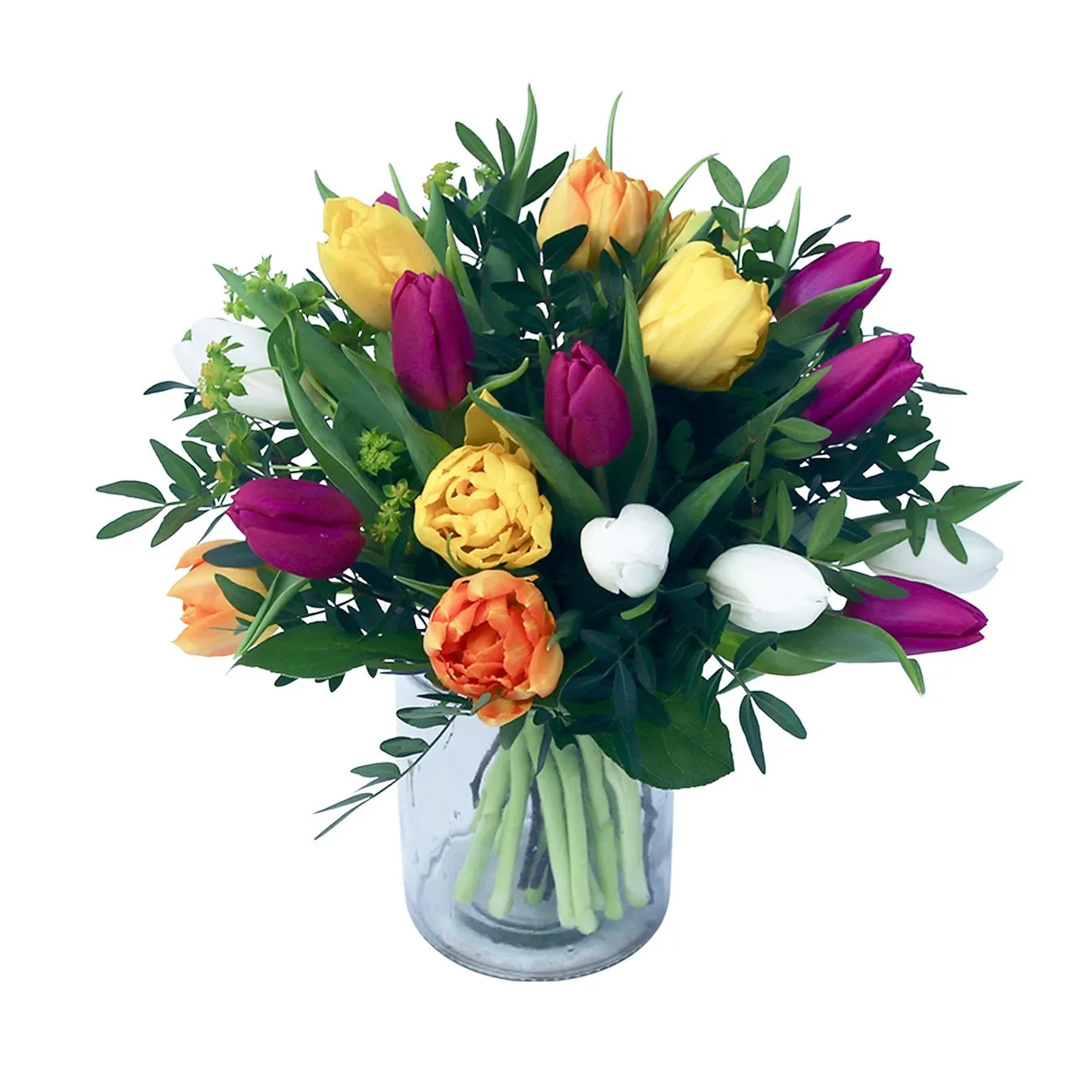 Send a delightful spring greeting with tulips. This colourful bouquet will cheer up the recipient's day for sure and will spread some spring feeling. Amount of tulips around 20. Note! the colors may vary depending of the store's selection. Vase not included.