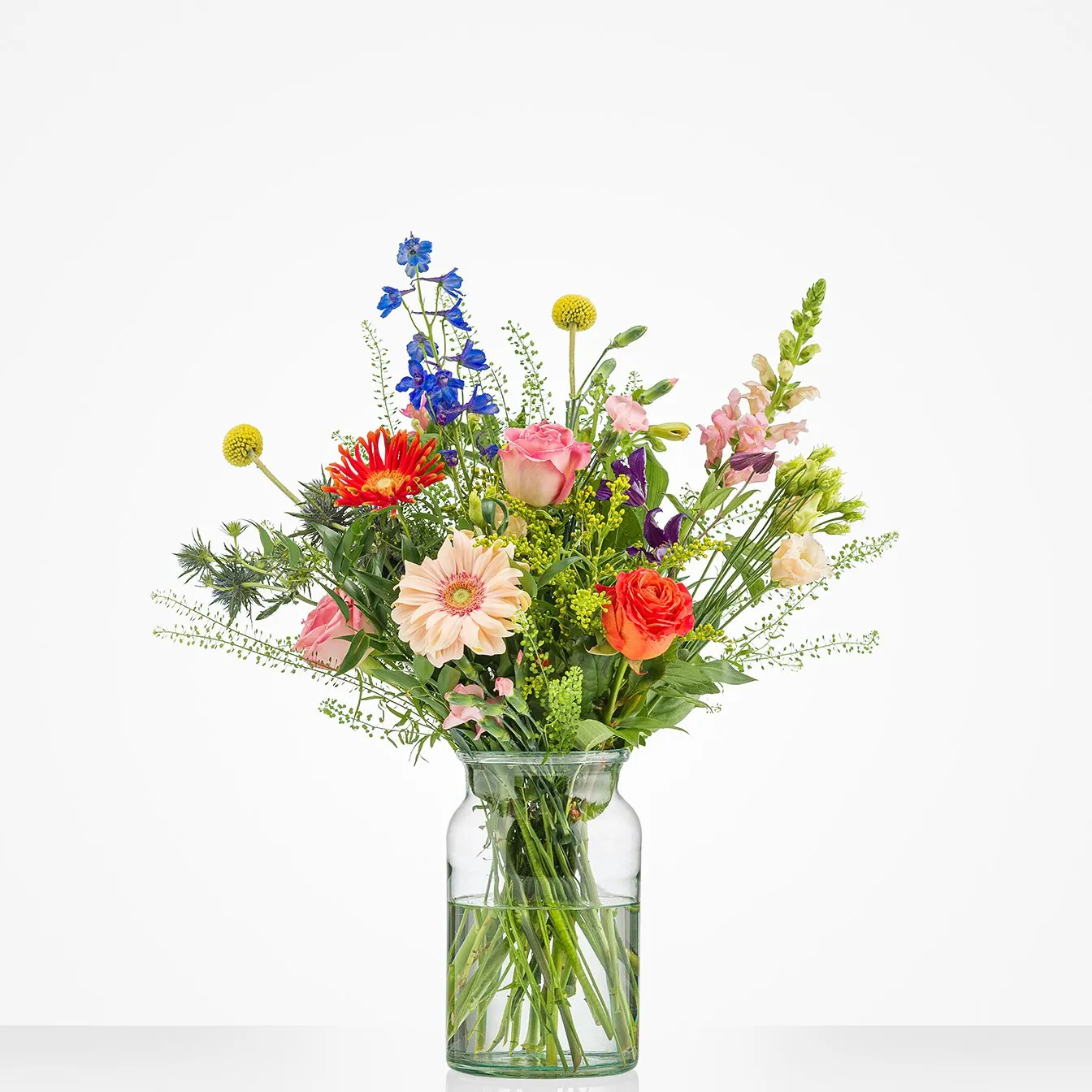 A hugely colourful surprise! That's what makes this bouquet so popular. This bouquet exudes real floral opulence with its cheerful colour combination. Suitable for happy occasions, or when you want to make someone's day. Excl. vase