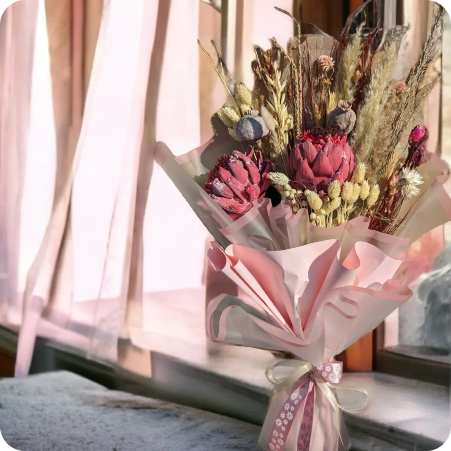 Bukiet z oferty regionalnej - Poczta Kwiatowa® WarszawaSugar Rush to bukiet, który wzbudza słodkie emocje i zachwyca niezwykłym pięknem. Skomponowany z suszonych kwiatów i roślin, a także zawierający spektakularne kwiaty protei, ten bukiet jest wyjątkowy i pełen uroku.Protea, znana także jako "kwiat bankietowy," jest kwiatem o wyjątkowym kształcie i egzotycznym uroku.Sugar Rush to doskonały prezent na wiele okazji. Jest to bukiet, który przynosi ze sobą nie tylko piękno kwiatów, ale także wyjątkowe i niezapomniane wrażenia. To kompozycja, która jest jak słodka chwila przyjemności, dodając urody i radości każdemu dniu.