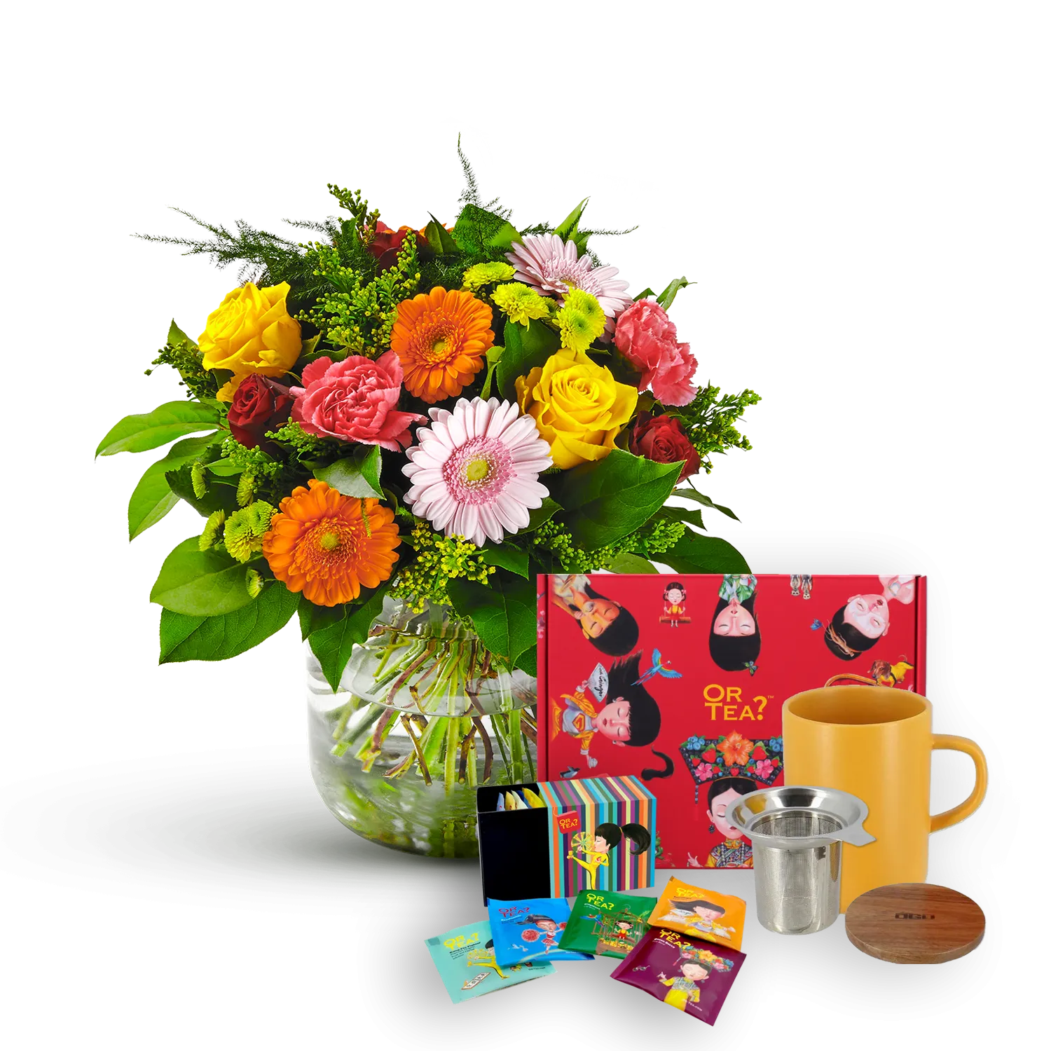 This coloured bouquet is a pleasure for the eyes. Certainly when you want to congratulate, brighten up or simply thank someone. The enclosed Gift box contains 12 classic tea bags, OGO Living mug and a lid and stainless steel tea filter.Vase excl.