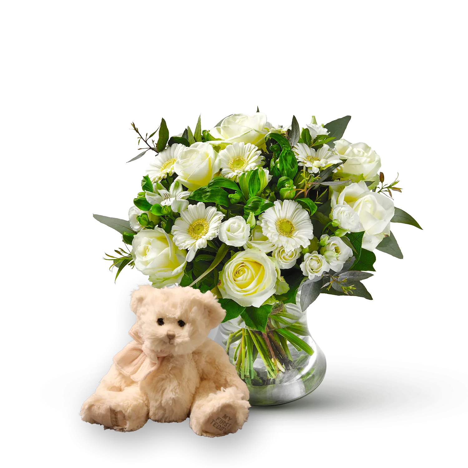 You would like to congratulate someone with the birth of their child? Then surprise the brand new parents with this birth bouquet. This bouquet with white seasonal flowers is delivered together with the 'My first teddy' from Interflora.With this bouquet you give flowers and a gift that the child will have fun with. An ideal gift for both parents and the new baby.