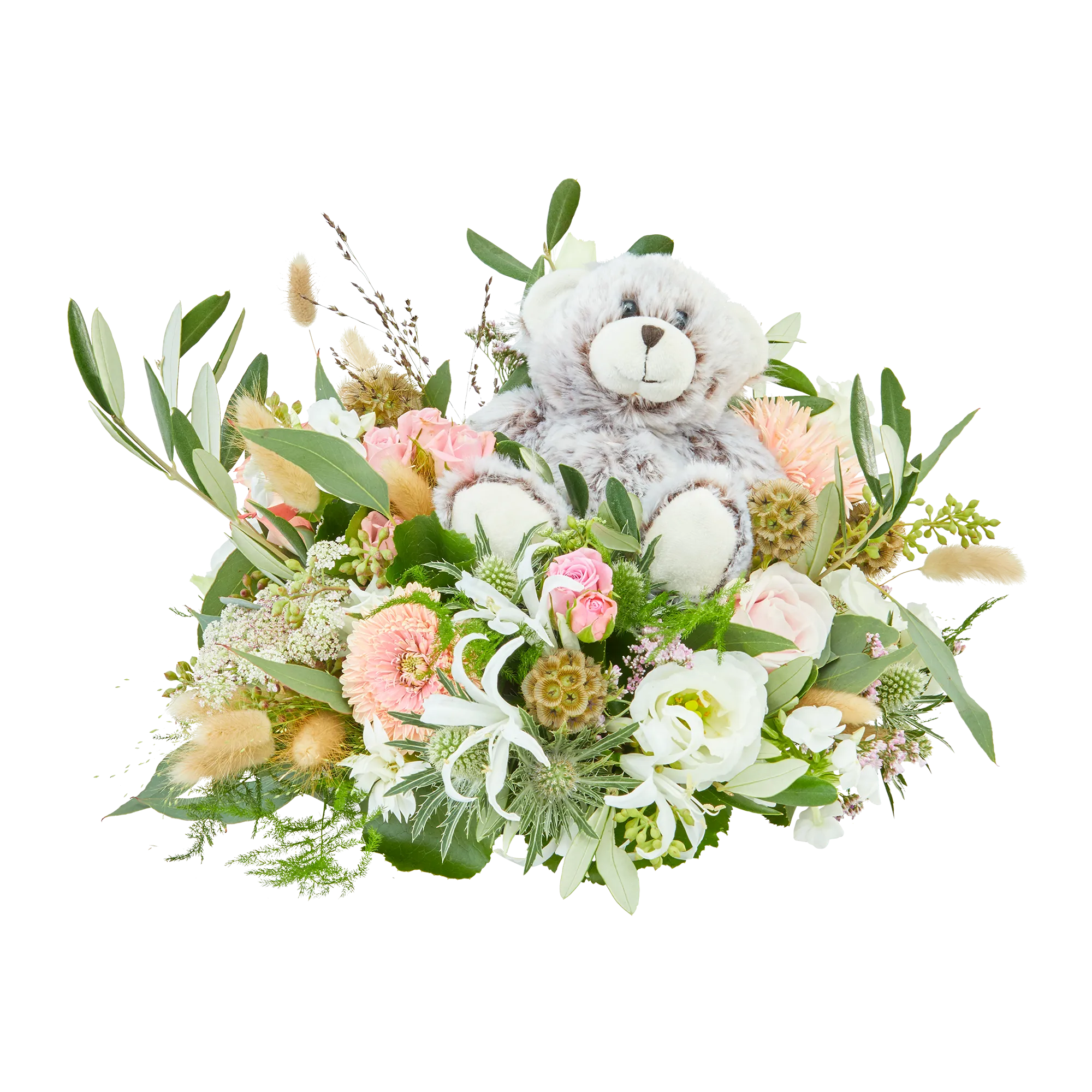 The special form 'soft hug' is a round flower arrangement with a small cuddle bear incorporated.