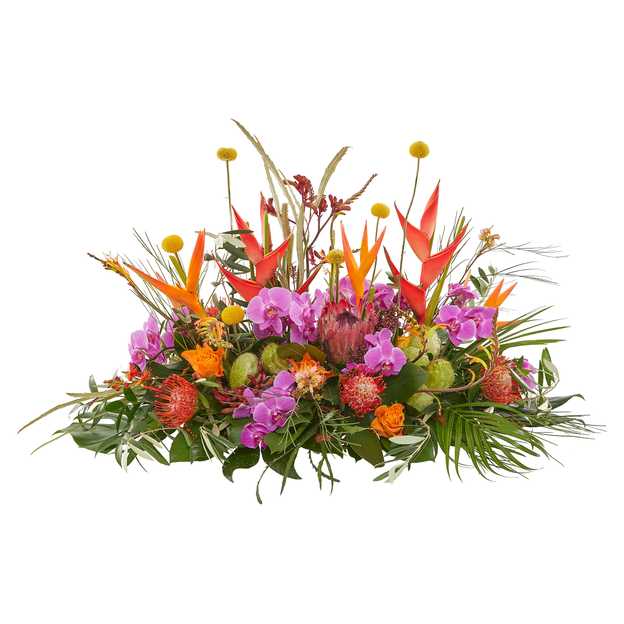 The oval flower arrangement 'Tropical Garden' is an airy and modern colourful flower arrangement.