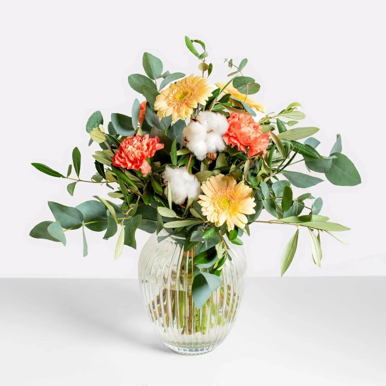 Round hand-tied bouquet in apricot-orange-white with germini, carnations and cotton. Olive and eucalyptus are used as accessories.