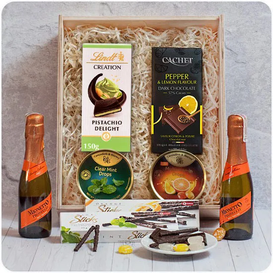 What can I give my loved ones for their holiday? Poczta Kwiatowa® offers the perfect set to celebrate many occasions - the orange and mint set. In the wooden box, recipients will find two small Prosecco champagnes, orange- and mint-flavoured candy bars, Belgian mint chocolate and Belgian chocolate with almonds and orange. Such a composition of excellent tastes will surely appeal to your taste and make the time of your loved ones more pleasant.Orders which are paid for before 12 o'clock will be delivered the next, working day. Orders within the borders of the city of Warsaw can be delivered the same day, as long as they are confirmed over the phone.Orders are fulfilled within 24 hours.The set does not contain a plate.