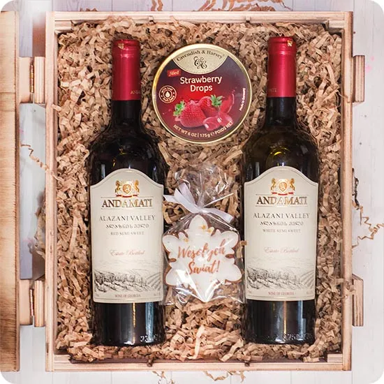Christmas Set - Andamati is a unique gift that will transport the recipient to a magical world of flavors and aromas. Composed with the utmost care, the set celebrates the uniqueness of moments spent with loved ones, giving them a noble and festive character.In an elegant, burnished box, the recipient will find:Andamati white wine - a semi-sweet Georgian wine is perfect for celebrating and emphasizing the uniqueness of holiday moments.Andamati red wine - semi-sweet Georgian wine is a great companion for both Christmas dishes and relaxing evenings.Strawberry-flavoured Cavendish Landrynki - these fruity, tempting treats go well with wines, adding notes of sweetness to the festive joy.Gingerbread Merry Christmas - to complete the festive atmosphere, the set includes a gingerbread decorated with the words "Merry Christmas". It is not only a tasty addition, but also an expression of the traditions and warmth that accompany Christmas.Christmas set - Andamati is not only a combination of excellent wines and sweets, but also an expression of attention to detail and the uniqueness of moments spent in a festive environment. Each element of the set has been carefully selected to create a flavor composition that takes you into an atmosphere of joy and shared celebration.Poczta Kwiatowa® Orders paid for by 5pm will be delivered the next business day. We deliver orders within Warsaw on the same day after telephone confirmation. We also deliver gifts to selected localities on Saturday.