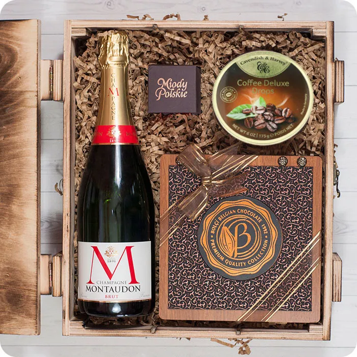 Champagne set is a luxurious gift that will surely satisfy even the most demanding gourmets. This elegant set is a combination of refined taste, delicacy and high-quality ingredients, packed in a charming wooden box with a smoky finish.