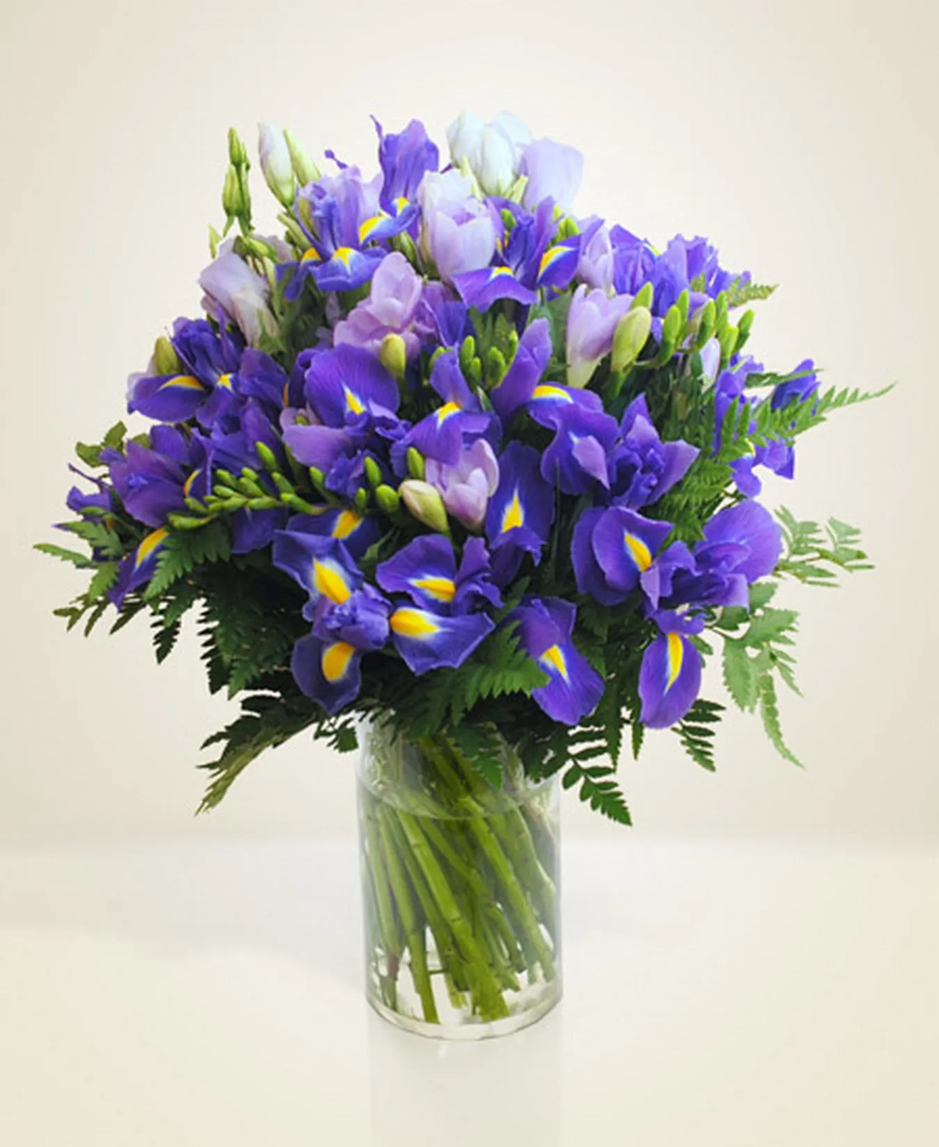 Bukiet w odcieniach fioletu z 24 irysami, 10 frezjami, 3 lisianthusami i ozdobną zielenią. Zaimponuj wręczając ten uroczy bukiet!Dostępność: Cały rok