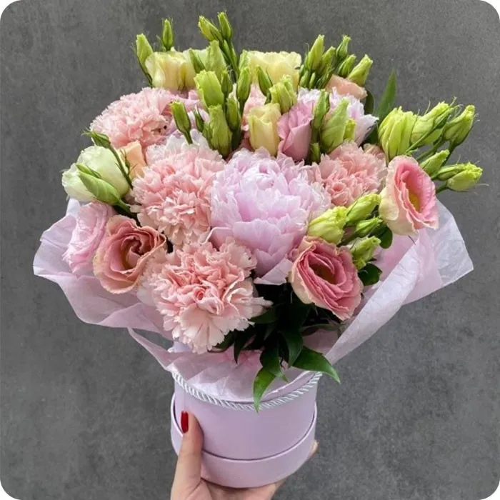 Flowerbox Mieszanka to kompozycja, która wyróżnia się różnorodnością i pięknem. Składający się z goździków, eustom i piwonii, ten uroczy zestaw kwiatów umieszczony jest w eleganckim pudełku, tworząc kompozycję, która przyciąga uwagę i zachwyca.
