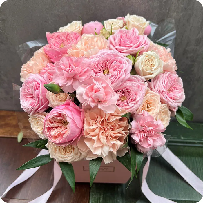róże, goździki, piwonie, pudełko