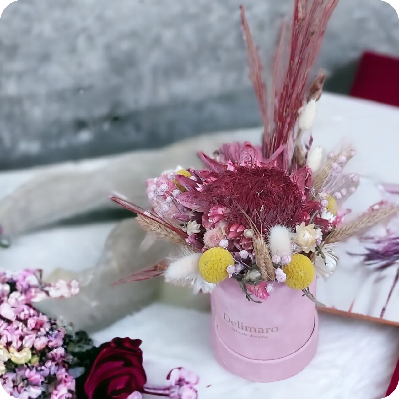 Bukiet z oferty regionalnej - Poczta Kwiatowa® WarszawaFlowerbox z Proteą to niezwykła kompozycja, która przynosi do naszych domów egzotyczne piękno i trwałość. Ten Flowerbox zawiera suszone rośliny, zboże i wyjątkowy kwiat protei, tworząc wyjątkową atmosferę i urok.Protea, znana także jako "kwiat bankietowy," jest kwiatem o wyjątkowym kształcie i egzotycznym uroku.Flowerbox z Proteą to doskonały prezent na wiele okazji. To kompozycja, która jest jak podróż w egzotyczne krajobrazy, przynosząc radość i urodę każdemu dniu. To także doskonały wybór na dekorację wnętrza, aby wniosła do domu cząstkę tajemnicy i piękna.