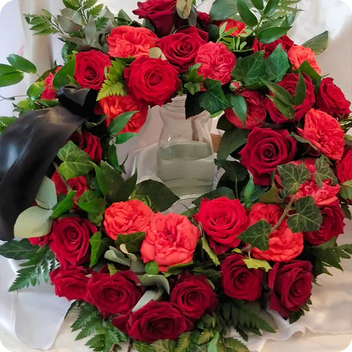 Bukiet z oferty regionalnej - Poczta Kwiatowa® TychyWieniec Głęboki Smutek to wyraz szacunku, współczucia i pamięci, skomponowany z najpiękniejszych czerwonych róż. Ta kompozycja kwiatowa jest hołdem dla tych, którzy odeszli, oraz wyrazem wsparcia dla bliskich w trudnym czasie żałoby.Czerwone róże, będące sercem tego wieńca, to nie tylko symbol miłości, ale także przypominają o siłach i więzach, które przetrwają przez wieczność. Ich płatki w głębokim odcieniu czerwieni oddają hołd osobie, która odeszła, jednocześnie wyrażając wdzięczność za wspólne chwile i piękne wspomnienia."Wieniec Głęboki Smutek" z oferty Poczty Kwiatowej® jest pięknym wyrazem pamięci i docenienia życia osoby, która odeszła. Wieńce z czerwonych róż niosą ze sobą nie tylko piękno, ale również wyraz uczuć, które pozostaną żywe w sercach bliskich na zawsze.Dostępność: Cały rok