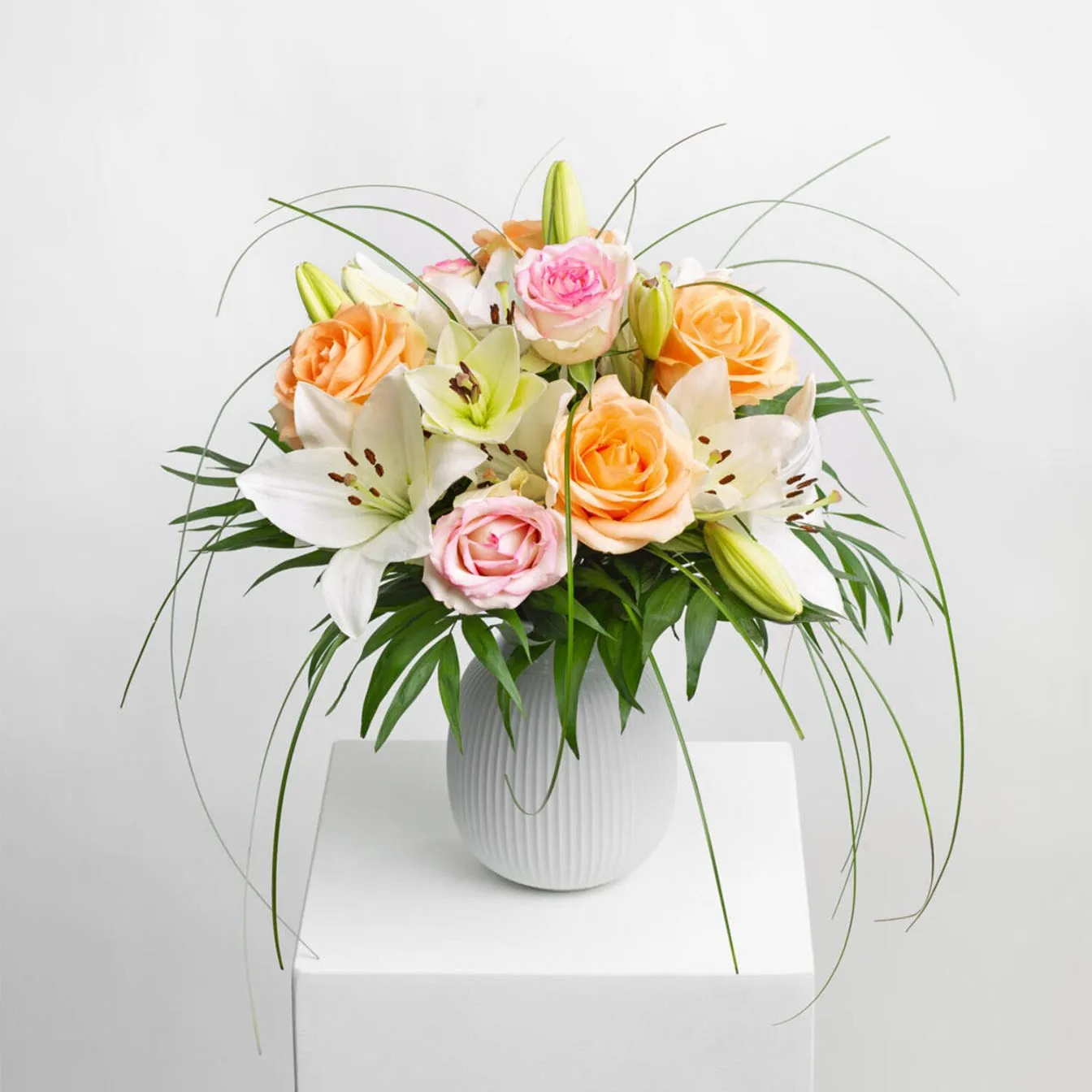 Wyślij swoim bliskim anioła stróża z naszym pięknym ręcznie robionym bukietem w biało-różowej moreli z różami i liliami z trawą niedźwiedzia i chico dla dekoracyjnej zieleni.