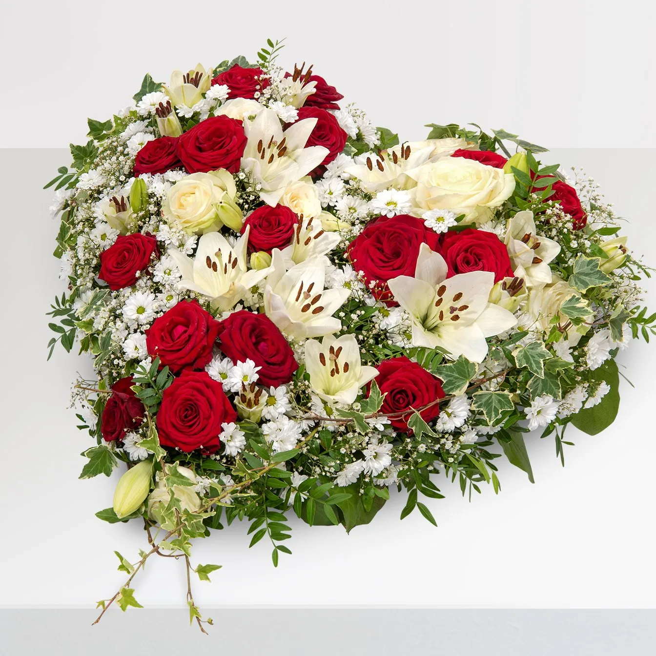 Heart-shaped funeral arrangement in red-white with roses, santini, gypsophila and lilies. Additional green as pistachio and shallon is also used.Dostępność: 01.01 - 31.12
