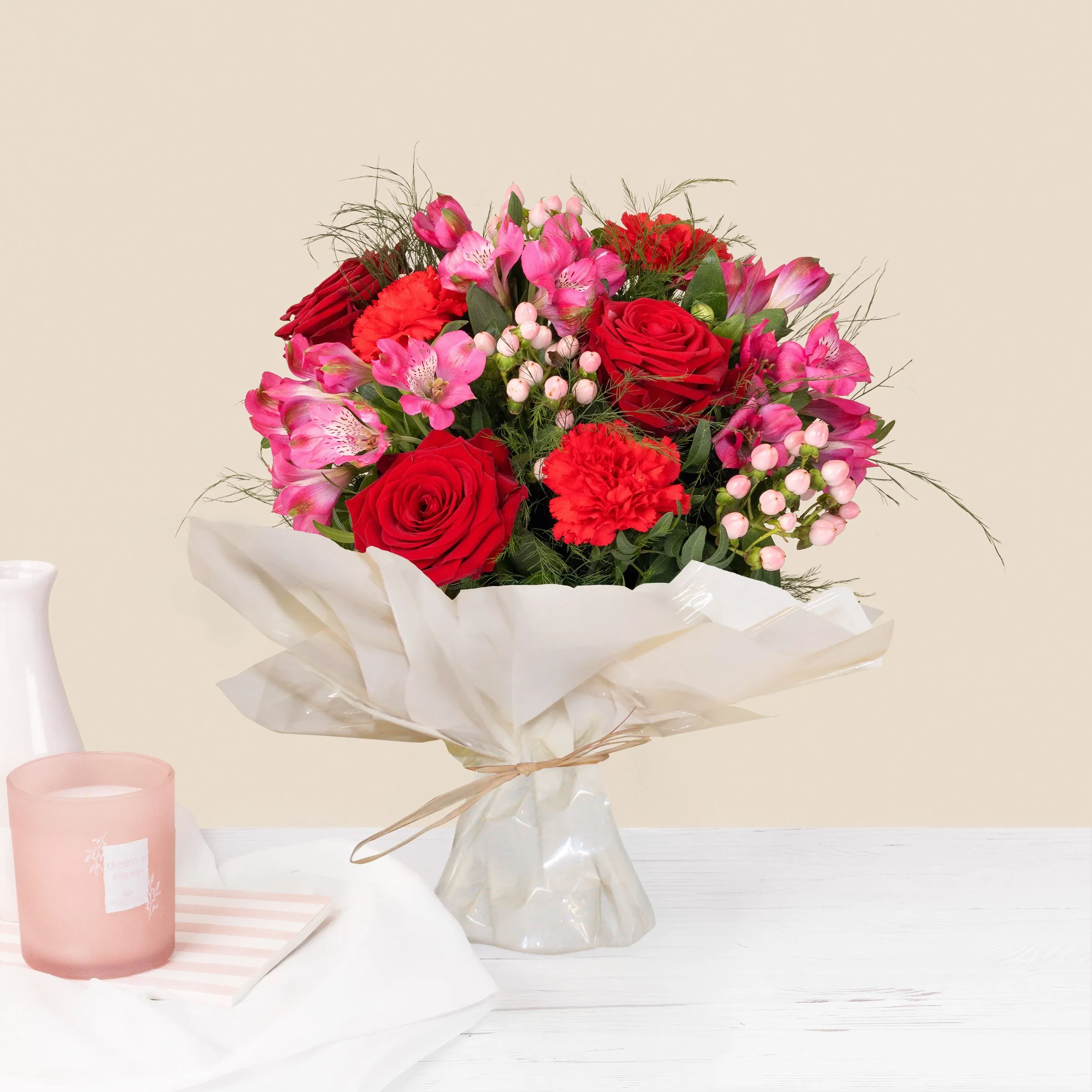 Przedstawiamy nasz ponadczasowy bukiet Kiss, dostarczany w bańce wodnej, aby przedłużyć świeżość bukietu do momentu, gdy odbiorca umieści go w wazonie. Nie sposób mu się oprzeć. Jego delikatna kompozycja zawiera ogniście czerwone róże, symbolizujące namiętność. Kwiatowa kreacja, która z pewnością dotrze do odbiorcy i roztopi serce ukochanej osoby, obiecujemy! Bukiet jest dostarczany z bąbelkiem wody, aby dłużej zachował świeżość.
