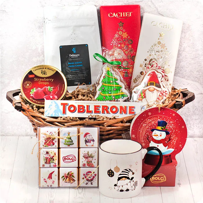 Jest Taki Dzień to wyjątkowy koszyk prezentowy, stworzony, aby uczynić każdą chwilę wyjątkową. Ten zestaw, pełen delikatności, słodyczy i radości, przywołuje uśmiech na twarzach i tworzy atmosferę magicznych chwil.W zestawie znajdziemy:Świąteczny kubek - początek tego magicznego zestawu to kubek ze skrzatem, który dodaje uroku i świątecznego nastroju do każdej porannej herbaty czy wieczornej kawy. Czekoladki Bolci - Czekoladki Bolci w formie świątecznych kafelków to nie tylko doskonała słodycz, ale również dzieło sztuki cukierniczej. Każdy kawałek to rozkosz dla podniebienia i festiwal smaków.Dwie czekolady Cachet z choinką - czekolady mleczne ozdobione choinką na opakowaniu to nie tylko pyszne łakocie, ale także ozdoba, która wprawi w świąteczny nastrój. To smaczny sposób na świętowanie magicznego dnia.Landrynki Cavendish - landrynki truskawkowe to kolorowy dodatek, który rozkwita słodyczą na podniebieniu.Małe Czekoladki Bolci - małe czekoladki ze świątecznymi obrazkami na opakowaniu to słodki akcent, który przywołuje atmosferę świąt.Kawa sypana Delimaro - aromatyczna kawa sypana to doskonały dodatek dla miłośników tego trunku. Zapach świeżo parzonej kawy dodaje energii i przyjemności do każdego momentu.Czekolada Toblerone Weiss - szwajcarska czekolada to wyjątkowy smak, którym można rozkoszować się w dowolnym miejscu i czasie. Klasyczny trójkątny kształt to symbol jakości i niezapomnianego smaku.Jest Taki Dzień to nie tylko zestaw prezentowy, to zbiór małych przyjemności, które sprawią, że każdy dzień stanie się wyjątkowy. Niech aromat kawy, słodycze i urok świątecznych ozdób otulą Ciebie lub obdarowanego tętniącą radością.Zobacz więcej podobnych produktów tutaj: BOŻE NARODZENIEPoczta Kwiatowa® Zamówienia opłacone do godziny 17:00 doręczymy następnego dnia roboczego. Zamówienia na terenie Warszawy doręczamy tego samego dnia po potwierdzeniu telefonicznym. Do wybranych miejscowości doręczamy prezenty także w sobotę.Dostępność: Cały rok