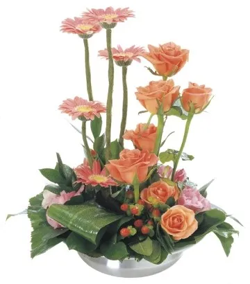 Proponujemy nowoczesną kompozycję w łososiowych kolorach. To oryginalne zestawienie umieszczono w srebrnej doniczce. Można tutaj znaleźć między innymi gerbery i róże, otoczone przez delikatne przybranie i zielone liście.