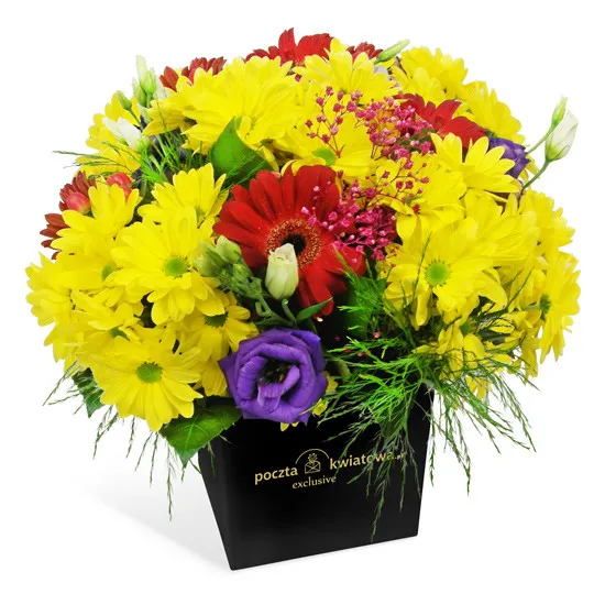 chryzantemy żółte, eustoma fioletowa, gerbera czerwona, hiperikum, gipsówka, treefern, aralia, orzech, aspidystra, opakowanie ochronne