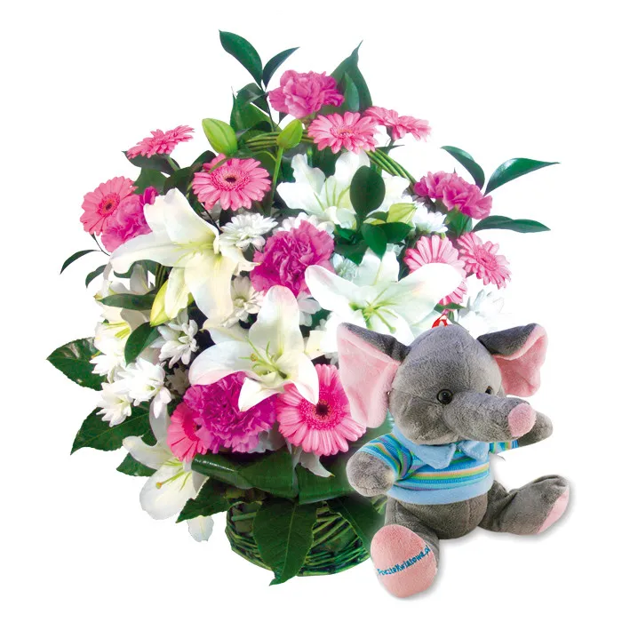 gerbery, lilie, goździki, santini, zieleń dekoracyjna, maskotka (słonik), kosz