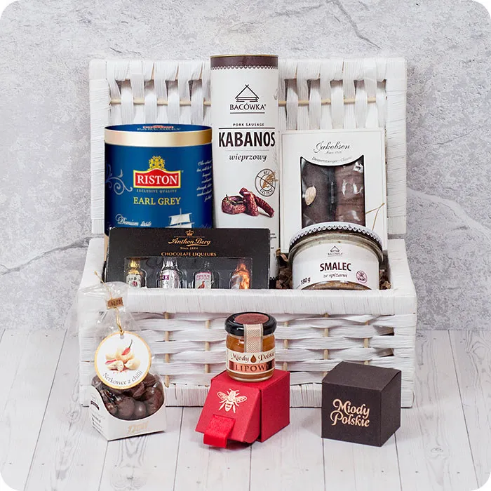 Wybór prezentu na wyjątkową okazję to nie lada wyzwanie. Podarunek powinien być przemyślany i trafiać w gust obdarowanego. Kosz jubilata to zestaw znakomicie skomponowanych frykasów, które znajdą uznanie u każdego konesera wysokogatunkowych przysmaków. W eleganckiej białej skrzyneczce znalazły się takie delicje, jak aromatyczna herbata w kartoniku ze szkockim motywem, wytworne czekolady z alkoholem, kabanosy z najlepszego mięsa wieprzowego, polski miód, marcepan oraz wykwintne orzechy nerkowca w czekoladzie z dodatkiem ognistego chilli. Nie ważne, czy świętujecie 5-, 15-, czy 50-lecie - kosz jubilata będzie doskonałym ukoronowanie tej doniosłej okazji.