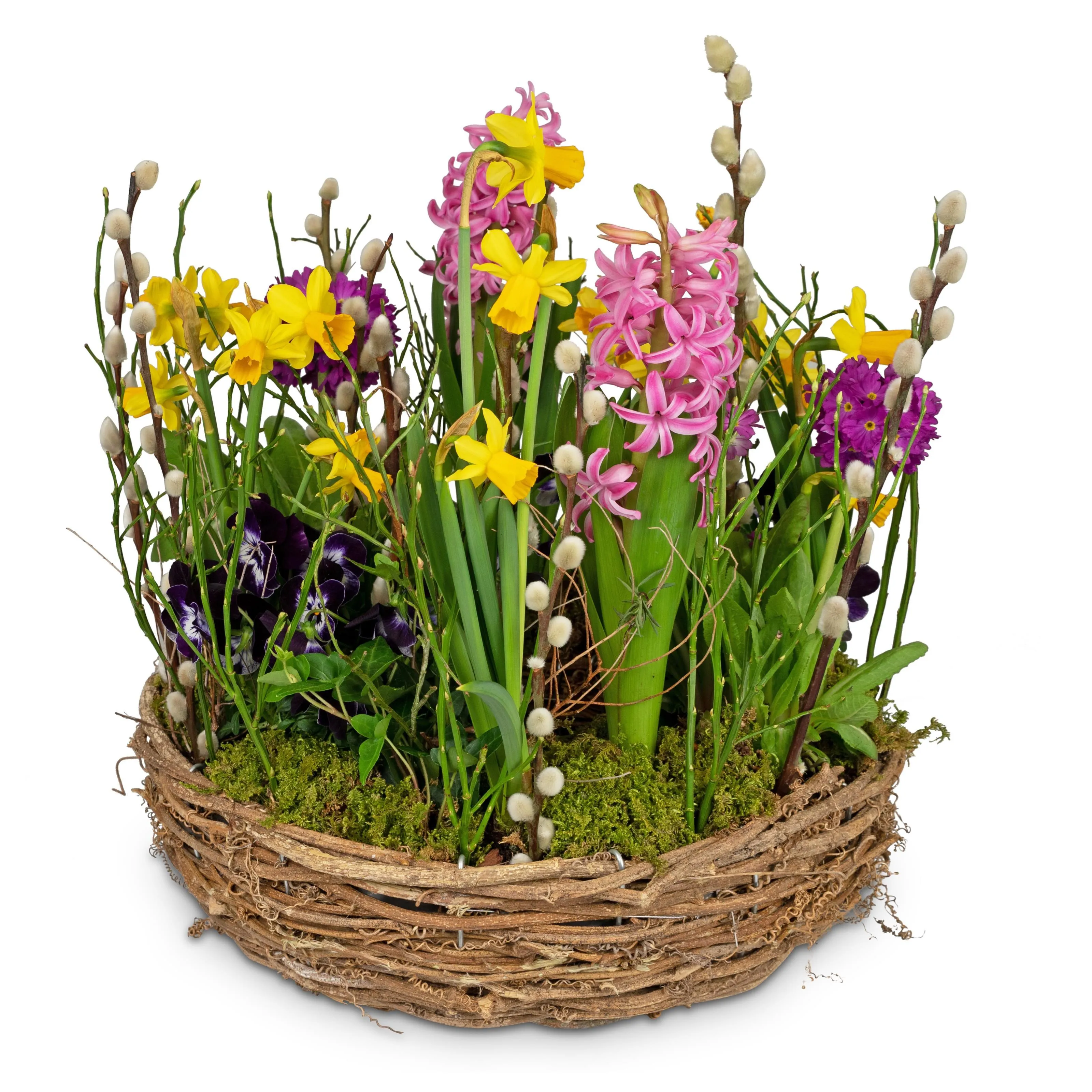 Czy wiosna może być jeszcze piękniejsza? Ten wieniec doskonale oddaje wiosenny nastrój. Tym miniaturowym ogrodem można cieszyć się w kółko. Przy dobrej pielęgnacji ten wieniec będzie cieszył oko przez długi czas. Wybór roślin oraz pojemnika może różnić się od przedstawionego na zdjęciu w zależności od dostępności.