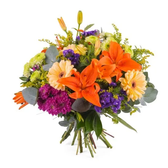 Bardzo dobrym rozwiązaniem będzie wysłanie kwiatów do Hiszpanii. Na zdjęciu obok prezentujemy kolorowy bukiet, który zdaje się mówić: “Uśmiech proszę!”. Takie optymistyczne zestawienie z pewnością rozwieje wszelkie troski. Znaleźć tu można między innymi lilie, gerbery i stokrotki, a wszystko to otoczone przez pasujące przybranie i zielone liście.