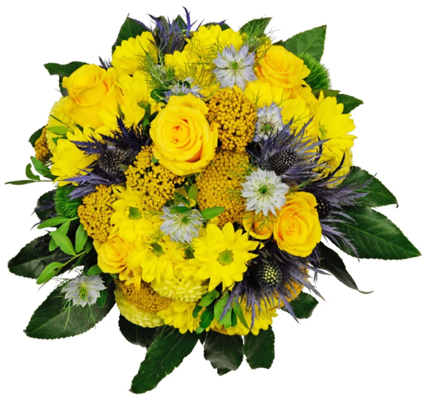 Wyślij żywy bukiet żółtych róż, sezonowych kwiatów i wyjątkowych niebieskich akcentów. Ta słoneczna i radosna kompozycja jest idealna na urodziny, życzenia powrotu do zdrowia lub aby wnieść światło i pozytywny nastrój do każdej przestrzeni. Odważna i radosna kompozycja kwiatowa z dostawą na cały świat.Dostępność: 01.05 - 31.12