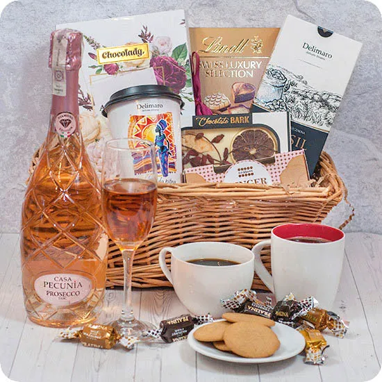 Nie masz pomysłu na prezent? Chcesz zrobić bliskim niespodziankę? Poczta Kwiatowa® oferuje nowy kosz upominkowy - Magia w blasku księżyca. W wiklinowym koszyku odbiorca znajdzie cukierki, pralinki czekoladowe, kawę rozpuszczalną, czekoladę z dodatkamji, ciasteczka korzenne, różowe Prosecco oraz kubek z czekoladą Delimaro do rozpuszczenia. Sposób przygotowania czekolady (przepis znajduje się również na odwrocie kubka): Wsyp czekoladę do gorącego mleka lub wody i mieszaj do rozpuszczenia (ok 45 sekund). W zależności od dodanej czekolady, napój wyjdzie bardziej lub mniej gęsty. Kieliszek, talerzyk i kubki nie znajdują się w zestawie prezentu, są tylko dekoracją.
