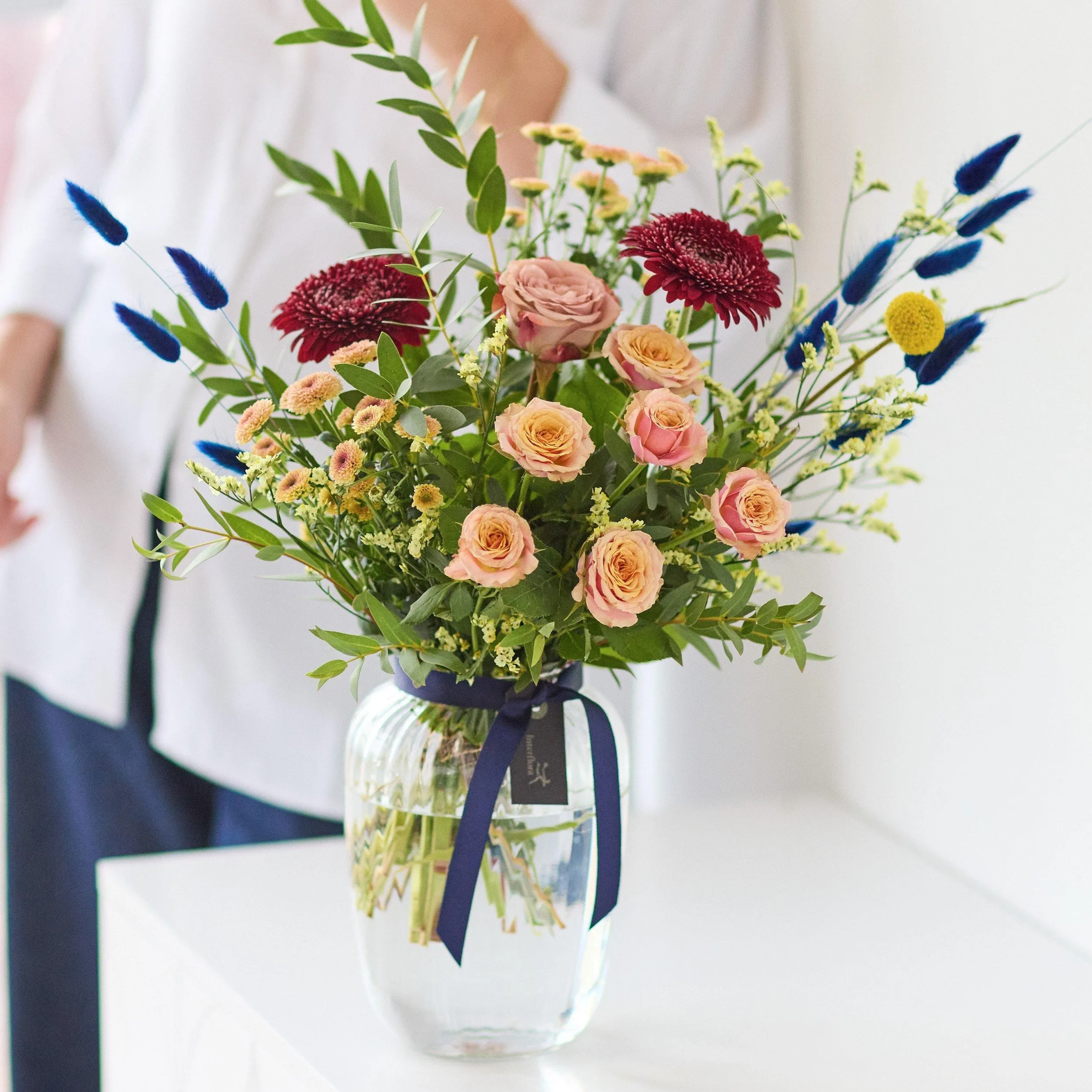 Wybór kwiatów sezonowych - każdy projekt jest jedyny w swoim rodzaju, stworzony przez kwiaciarnię rzemieślniczą przy użyciu najświeższych łodyg dostępnych w danym dniu.Dostępność: Cały rok
