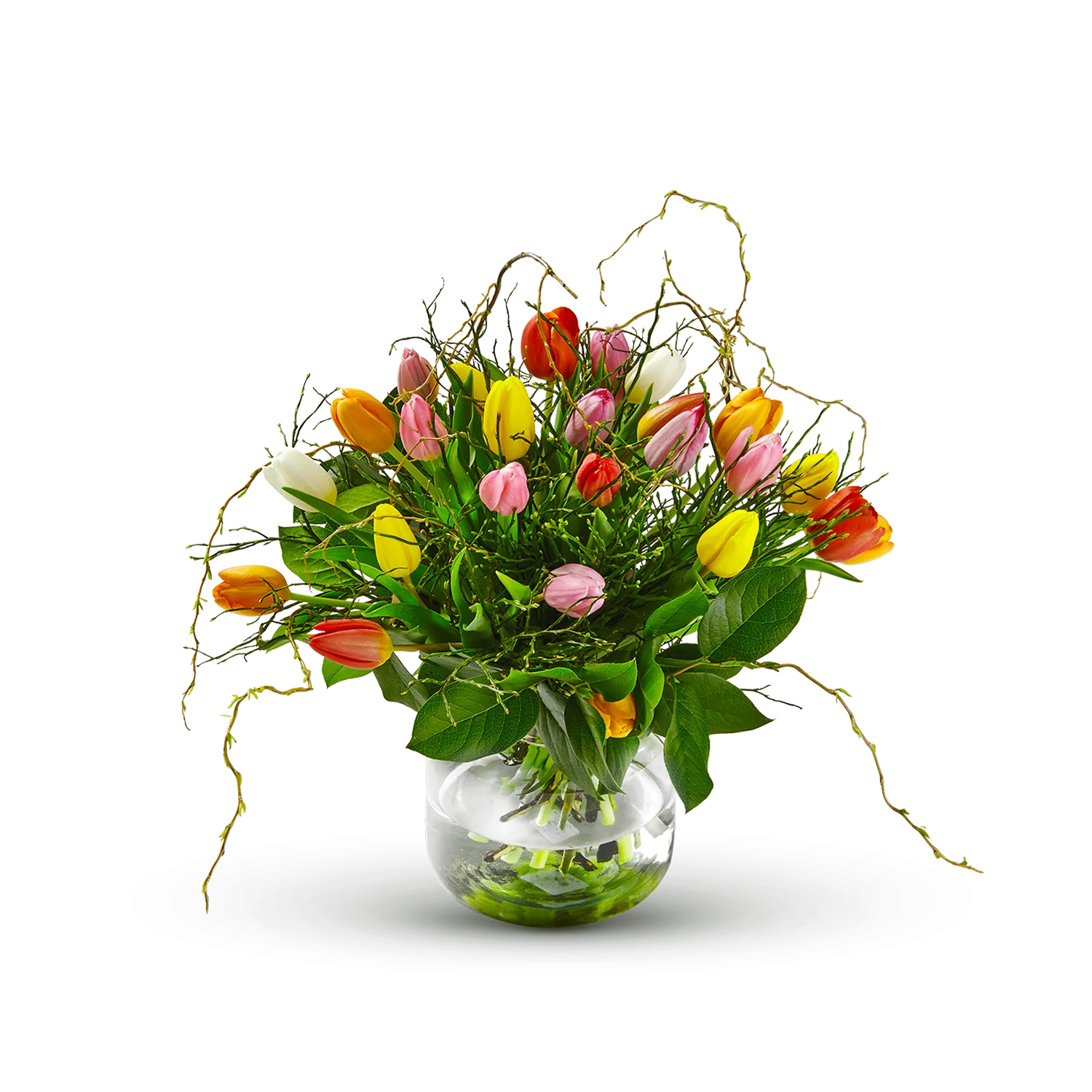 Przynieś wiosnę do swojego domu? Dzięki tej kolorowej mieszance tulipanów w mgnieniu oka stworzysz feerię barw. Lokalna kwiaciarnia wybierze najpiękniejsze odmiany dostępne w tym czasie w swojej kwiaciarni. (wybór może się różnić)Wazon z wył.