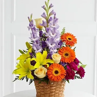 The Forever Dear Arrangement is a colorful assortment of flowers such as cream-colored roses, yellow Asiatic lilies, orange gerbera daisies, lavender gladiolus, plum carnations and purple statice, accented with assorted greens and displayed in a keepsake basket. (Flowers and basket may vary.)