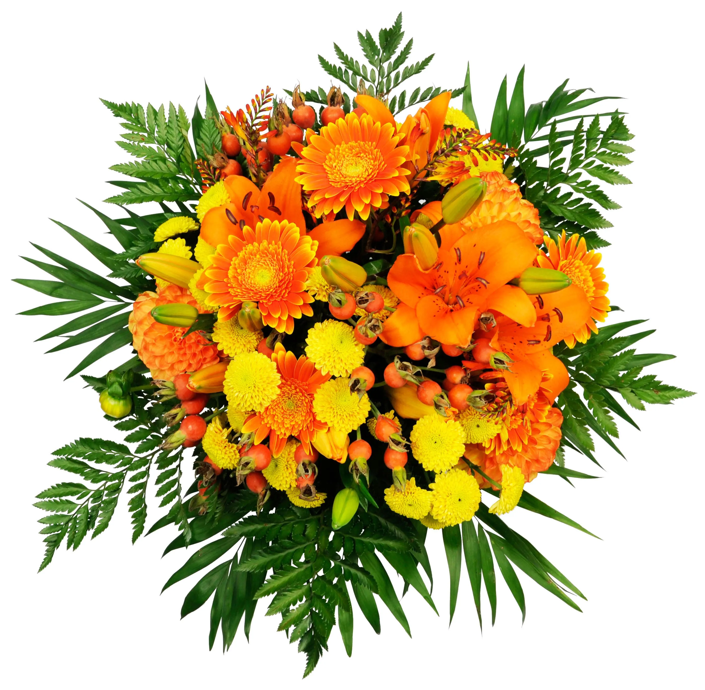 Ten ekstrawagancki, ręcznie wiązany bukiet ma prawdziwą atmosferę świętowania. Przy tak bogatej mieszance jasnych kolorów, głównie pomarańczowego i żółtego, oraz tak wielu ulubionych kwiatach, z pewnością jest czym się cieszyć.Dostępność: 02.03 - 31.08