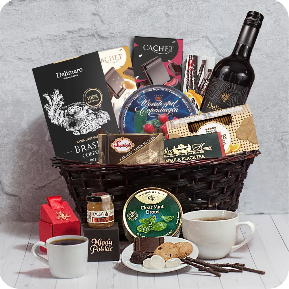 Kosz upominkowy Pełnia Szczęścia, to podarunek idealny na każdą okazję. W stylowym, bambusowym koszyku osoba obdarowana znajdzie smakołyki trafiające w najbardziej wyszukane gusta... Pyszna herbata, delikatna kawa, wyśmienite ciastka i czekolada z gruszką - to tylko część doskonałej zawartości tego wyjątkowego prezentu. W otoczeniu różnorodnych i znakomitych przysmaków ma swoje miejsce także cudowne czerwone wino. Dzięki temu podarunkowi niejeden wieczór zamieni się w niesamowitą podróż odkrywającą nowe, niepowtarzalne smaki.