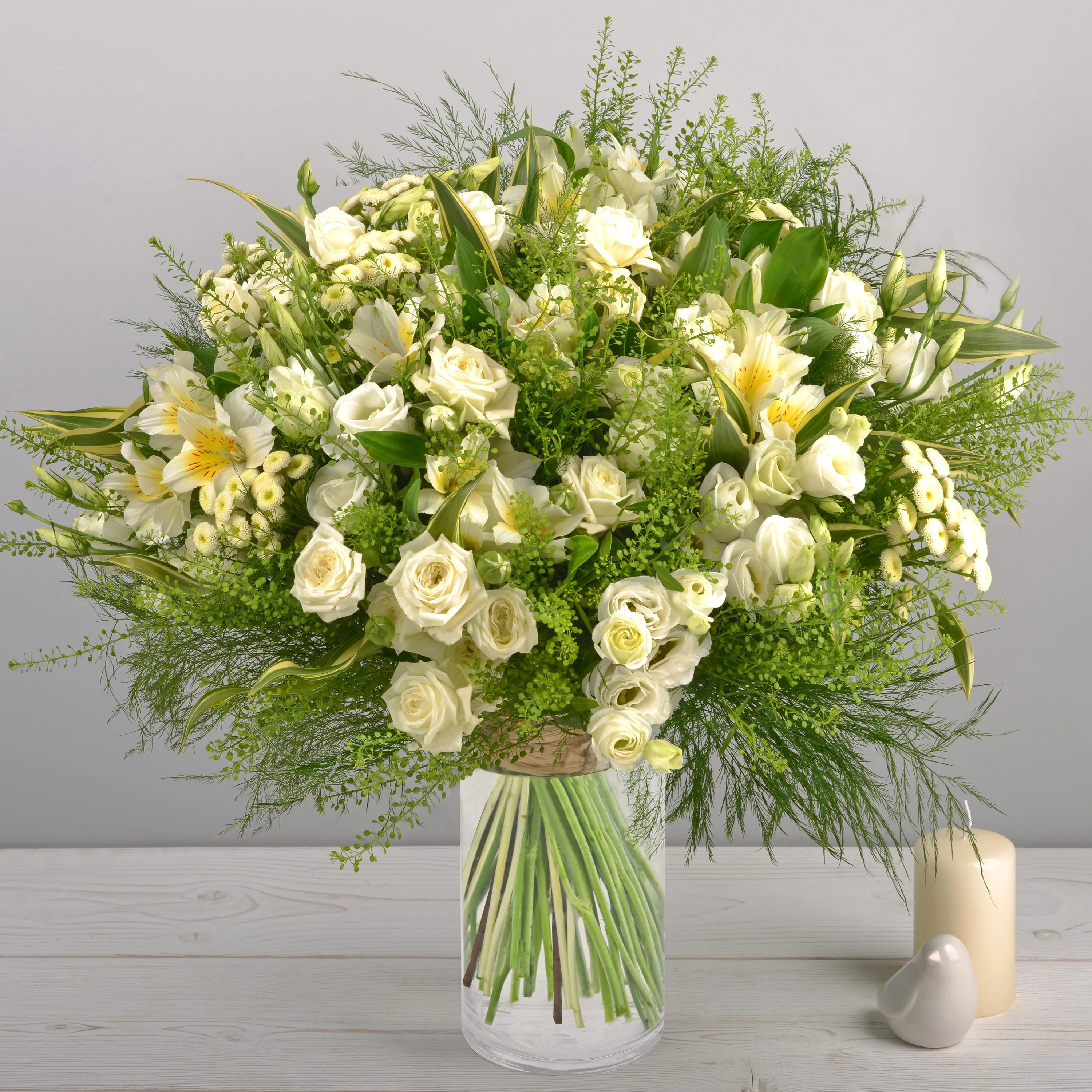 Zaokrąglony bukiet z białych kwiatów, z różami w sprayu (lub małymi pąkami), trawami, alstremerią i lisianthusem, ozdobiony lekkimi i zwiewnymi liśćmi.