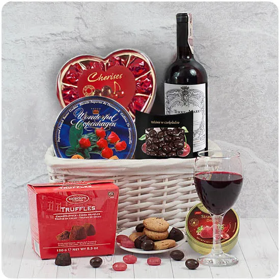 Walentynki to wyjątkowy dzień dla wszystkich zakochanych - to wie każdy. Jednak wyrażać miłość można również w inne, powszednie dni. W tych momentach Poczta Kwiatowa® pomaga wyrażać uczucia poprzez niezwykłe kosze upominkowe. Jednym z nich jest Prezent Kocham Cię - łączy on w sobie doskonałą czekoladę, wyśmienite wino białe półwytrawne Delimaro™, wiśnie w czekoladzie, czekoladki i pralinki - cały zestaw jest niezwykle estetyczny i romantyczny. Idealnie sprawdzi się jako prezent podarowany na wyjątkową okazję z ukochaną osobą.