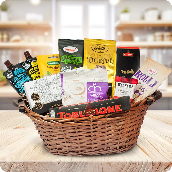 Przekąskowy Raj to wyjątkowy kosz prezentowy, który zachwyci każdego miłośnika pysznych przekąsek. W środku znajdziesz starannie dobrane produkty, które zadowolą podniebienia zarówno tych, którzy cenią sobie wytrawne smaki, jak i tych, którzy uwielbiają słodkości.