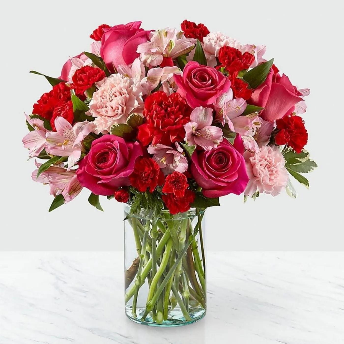Ręcznie wykonany i inspirowany wspaniałymi odcieniami sezonu, ten bukiet jest pełen słodkich uczuć dla ukochanej osoby. Gorące różowe róże, czerwone goździki, różowe alstroemerie i jasnoróżowe goździki zebrane w przezroczystym szklanym wazonie sprawią, że każde pomieszczenie stanie się piękne i lekkie.