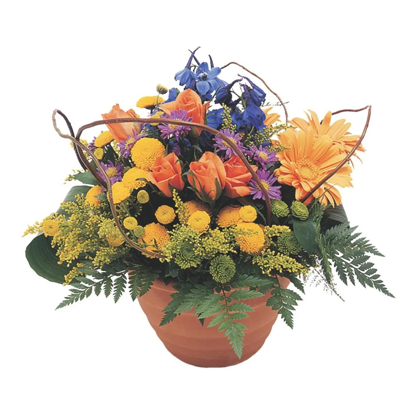 Selection of pretty colourful flowers in a terracotta pot